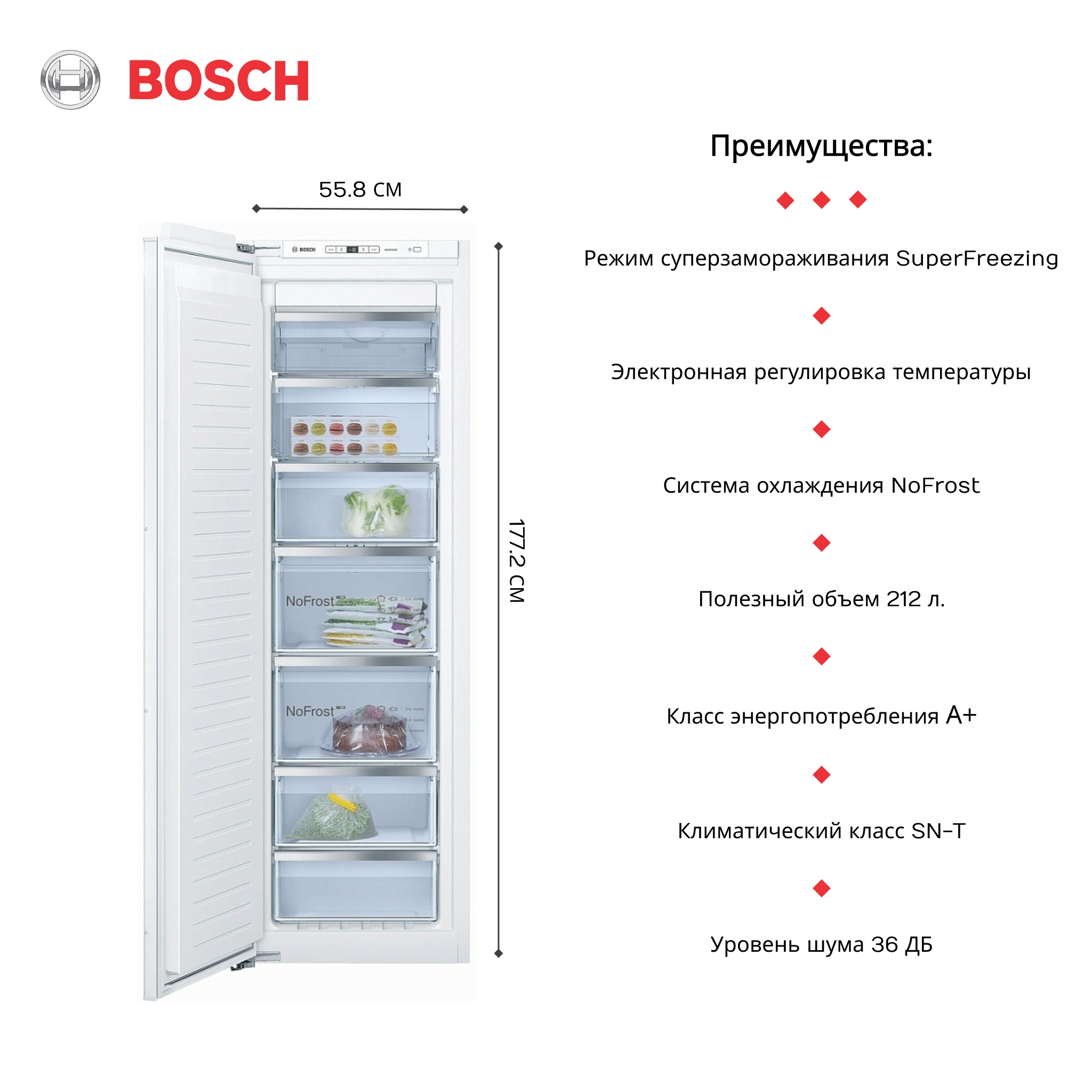 Стандартные габариты модели (высота 177.2 см, ширина 55.8 см, глубина 54.5 см) делают ее универсальным решением для большинства кухонных гарнитуров. Решив купить встраиваемую морозильную камеру Bosch GIN81AEF0, вы получаете не просто технику, а надежного помощника на долгие годы.