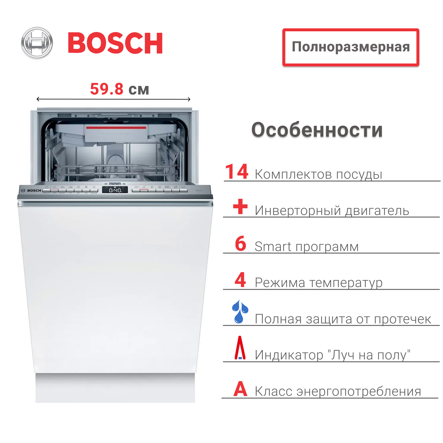 Встраиваемая посудомоечная машина Bosch SMV6YCX02E представляет собой современное и функциональное устройство, разработанное ведущим производителем бытовой техники. Эта полноразмерная модель, способная обслуживать до 14 комплектов посуды, идеально впишется в любой интерьер благодаря своему элегантному дизайну и панели управления из нержавеющей стали. Основой этой машины является инверторный двигатель EcoSilence Drive, который обеспечивает тихую и эффективную работу. Машина оснащена шестью стандартными программами стирки, включая автоматический, быстрый, экономичный, интенсивный, ночной режимы и мою программу. Кроме того, есть режим половинной загрузки, функции HygienePlus, IntensiveZone, SpeedPerfectPlus, Machine Care и экстра-сушка. Они позволяют оптимизировать процесс мытья посуды, делая его более эффективным и удобным.
