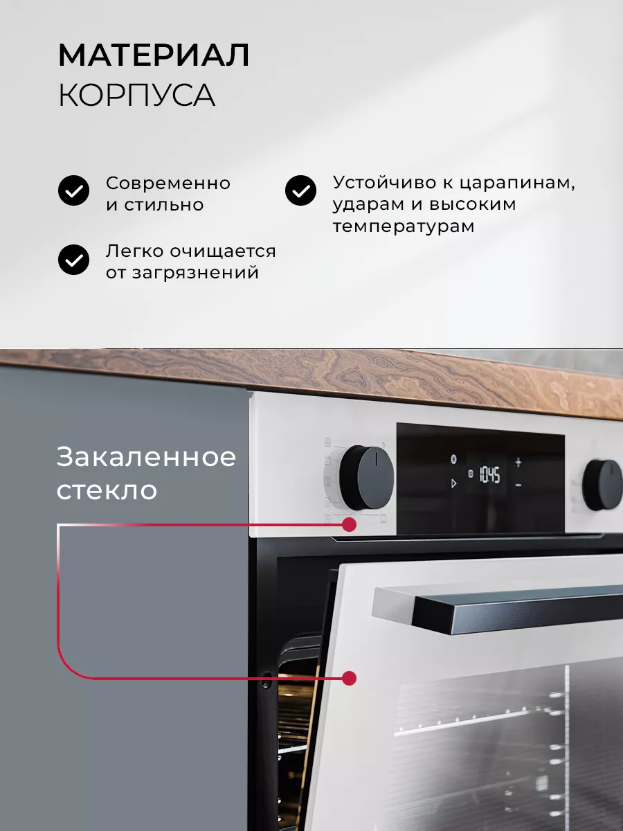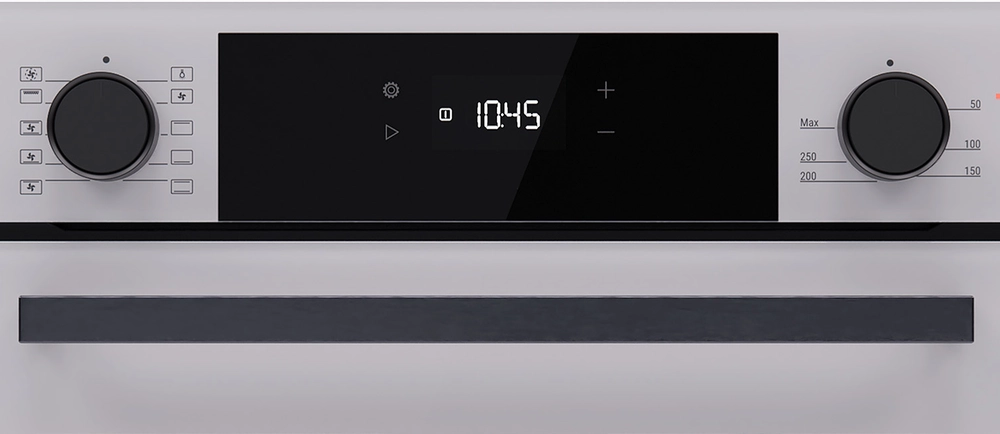 Точная настройка для удобного использования Смешанное управление сочетает сенсорные и механические элементы, обеспечивая точную регулировку параметров. LED-дисплей отображает все необходимые данные, а цифровой таймер помогает задать точное время готовки. Хромированные телескопические направляющие добавляют удобства, позволяя безопасно размещать и извлекать противни на нужной высоте.