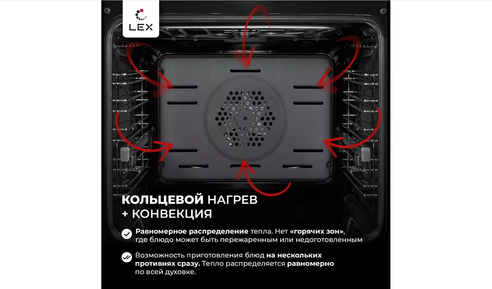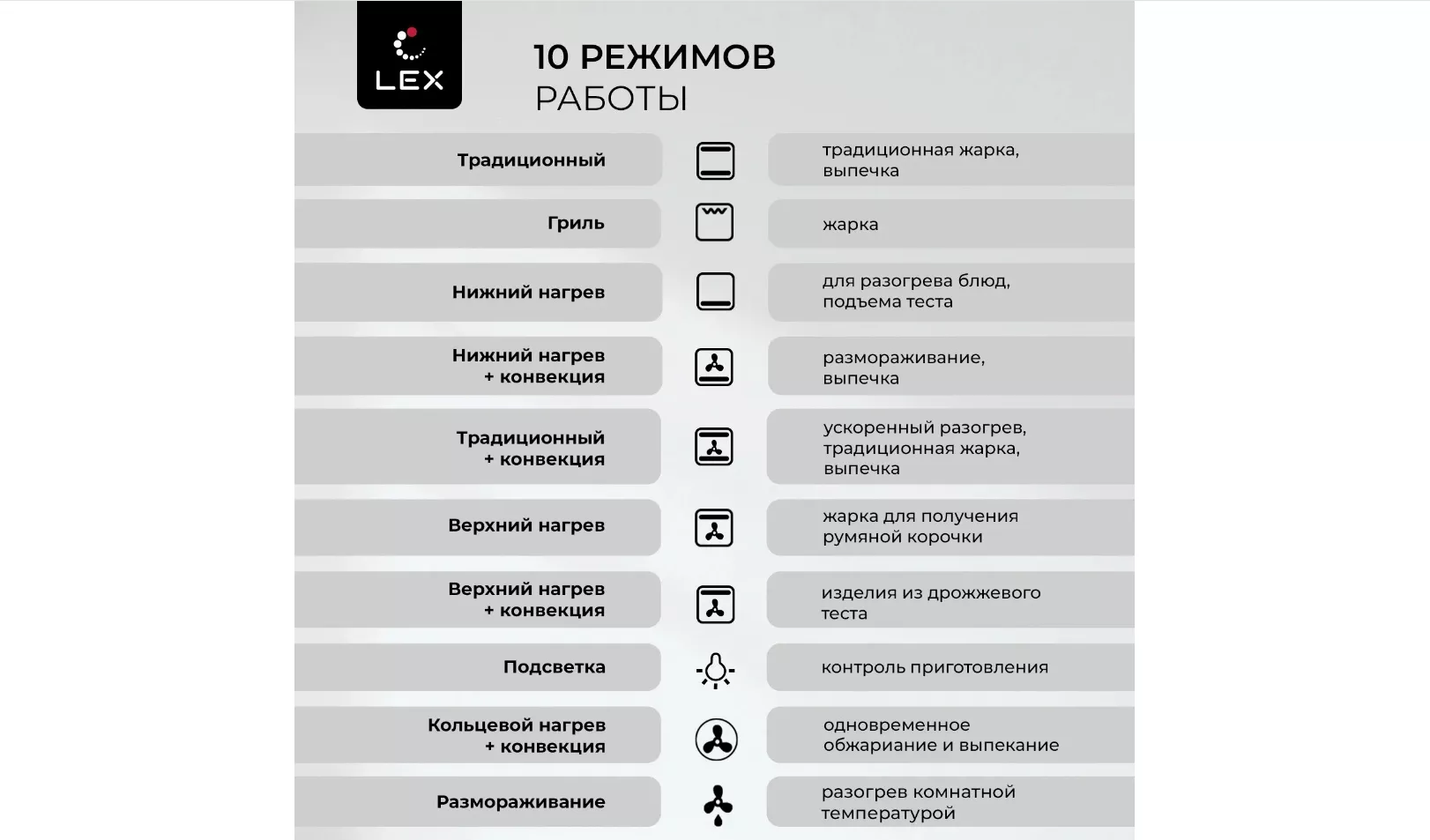 LEX EDP 610 Wide Series — 10 режимов для ваших кулинарных экспериментов Широкий выбор режимов позволяет адаптировать духовку под любой рецепт. Среди них — традиционный нагрев, конвекция с кольцевым нагревательным элементом, гриль и размораживание, что делает модель универсальной для готовки любых блюд. Мощность гриля 1200 Вт и температурный диапазон от 50 до 270°C обеспечивают быстрое и качественное приготовление пищи с идеальной текстурой.