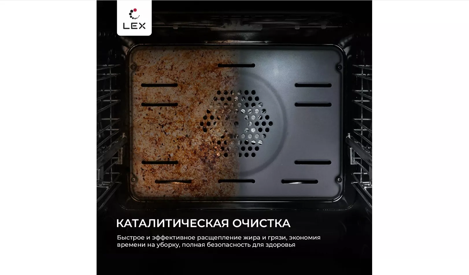 Безопасность и простота ухода Тройное стекло дверцы защищает от перегрева, а термостат обеспечивает дополнительную надежность. Каталитическая система очистки значительно облегчает уход за духовкой, помогая легко удалять жировые загрязнения. Быстросъемная дверца и набор телескопических направляющих делают процесс эксплуатации комфортным и безопасным.
