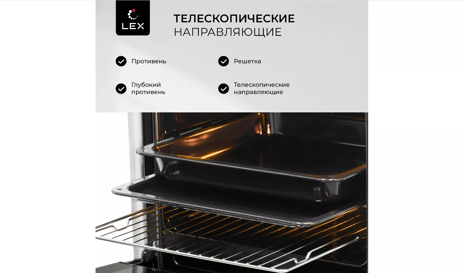 Хромированные телескопические направляющие — удобство и безопасность в использовании Духовой шкаф LEX EDP 610 Wide Series оснащен хромированными телескопическими направляющими, которые обеспечивают легкий доступ к блюдам во время готовки. Они позволяют безопасно и удобно извлекать противни, минимизируя риск ожогов и облегчая процесс приготовления.