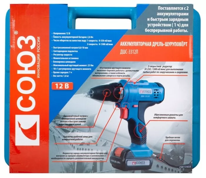 Дрель-шуруповерт аккумуляторная СОЮЗ ДШС-3312Л 22 Н·м