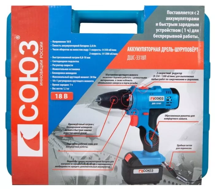 Дрель-шуруповерт аккумуляторная СОЮЗ ДШС-3318Л 26 Н·м