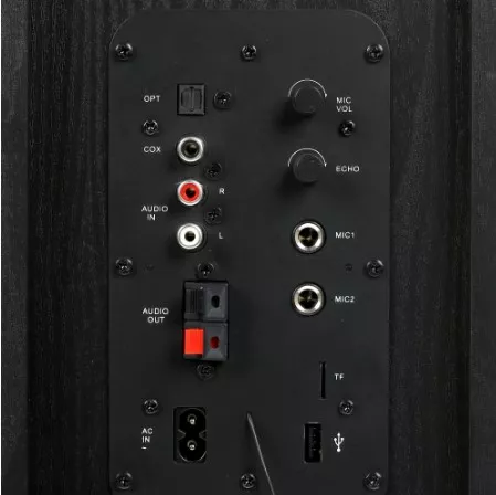 Колонки оснащены двумя выходами для микрофонов и устройством для чтения SD-карт, что позволяет использовать систему в качестве караоке-машины.