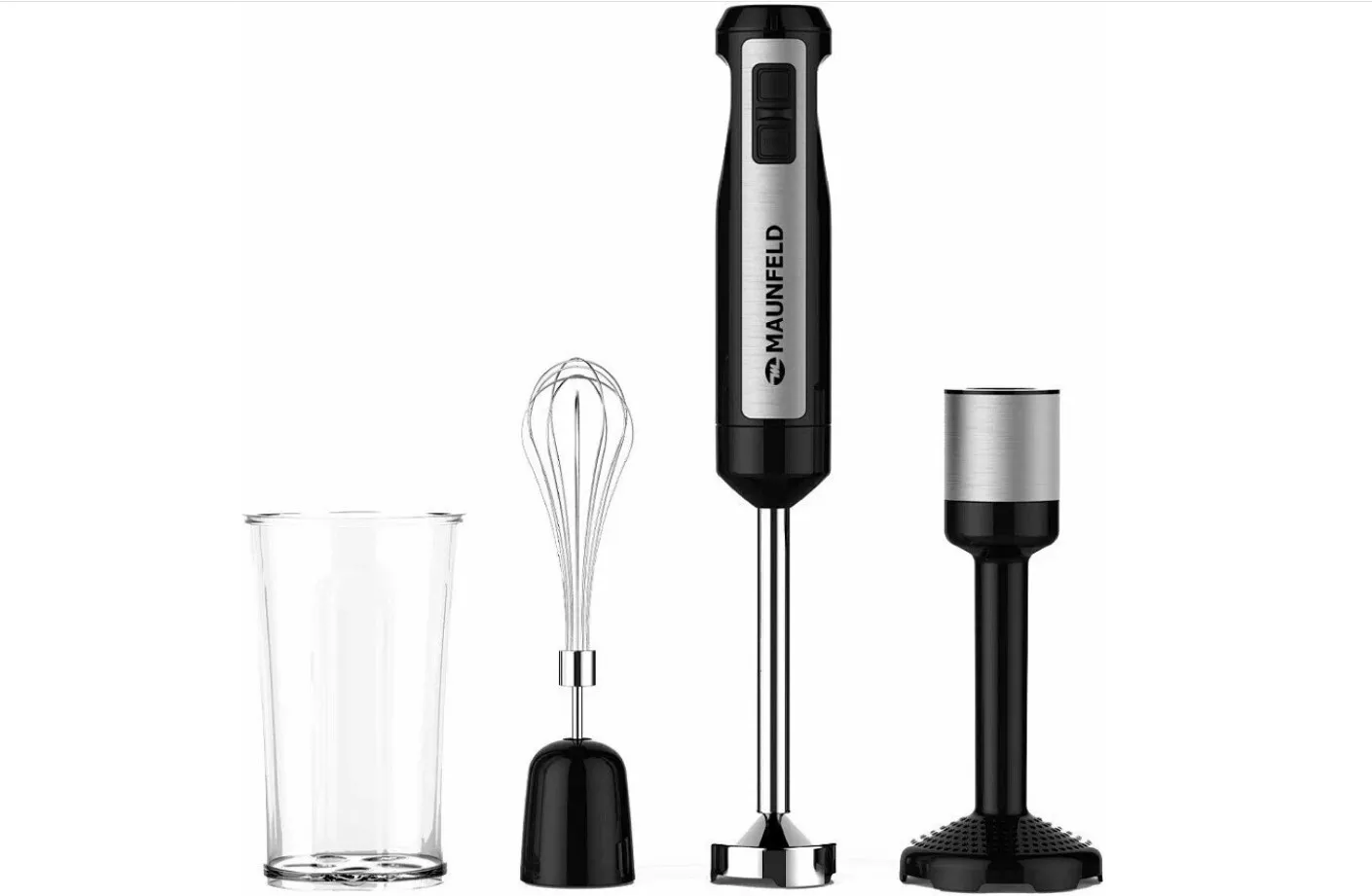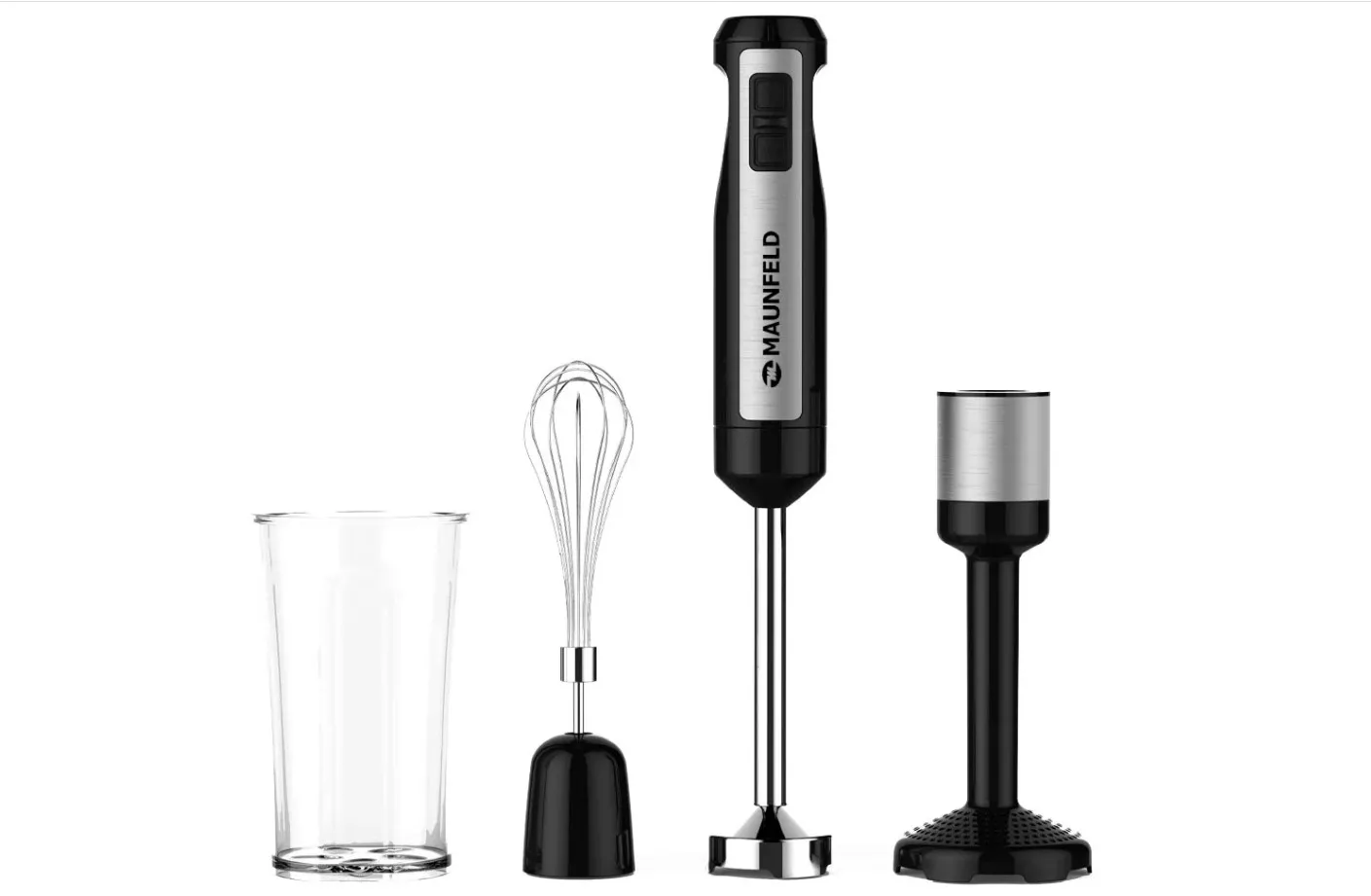 Блендер MAUNFELD MF-133B легко активируется простым нажатием кнопки на рукоятке и обеспечивает качественный результат измельчения продуктов в однородную массу. В рукоятку встроен мотор мощностью 1000 Вт, который позволяет добиваться эффективного результата за короткое время. Данная модель оснащена одним скоростным режимом и турборежимом. Погружная часть из нержавеющей стали снимается при необходимости очистки. Из дополнительных принадлежностей в комплекте с MAUNFELD MF-133B предусмотрены насадка для приготовления пюре, венчик для взбивания и мерный стакан объемом 600 мл.