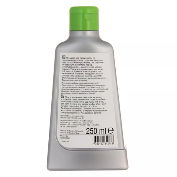 Чистящее средство Electrolux E6SCC104 предназначено для ухода за поверхностями из нержавеющей стали. Оно подходит для удаления отпечатков пальцев и разводов с варочных панелей, раковин, дверцы духового шкафа и других предметов.