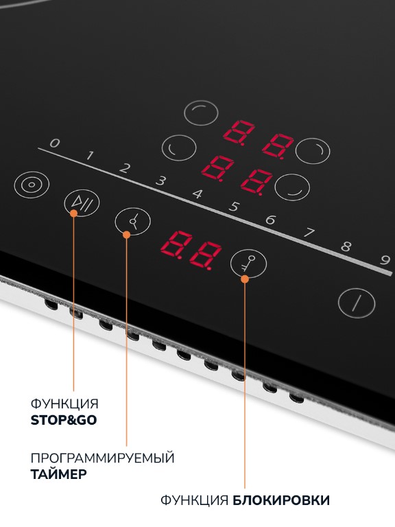 Функции безопасности: Кнопка блокировки панели, индикатор остаточного тепла, защита от перегрева, отключение при выкипании
