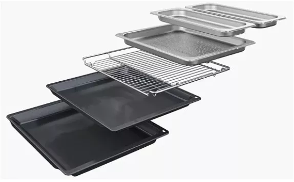 1 эмалированный противень для выпечки; 1 универсальный противень; 1 паросборник с отверстиями, размер XL; 1 паросборник без отверстий, размер M; 1 паросборник с отверстиями, размер M; 1 решетка |