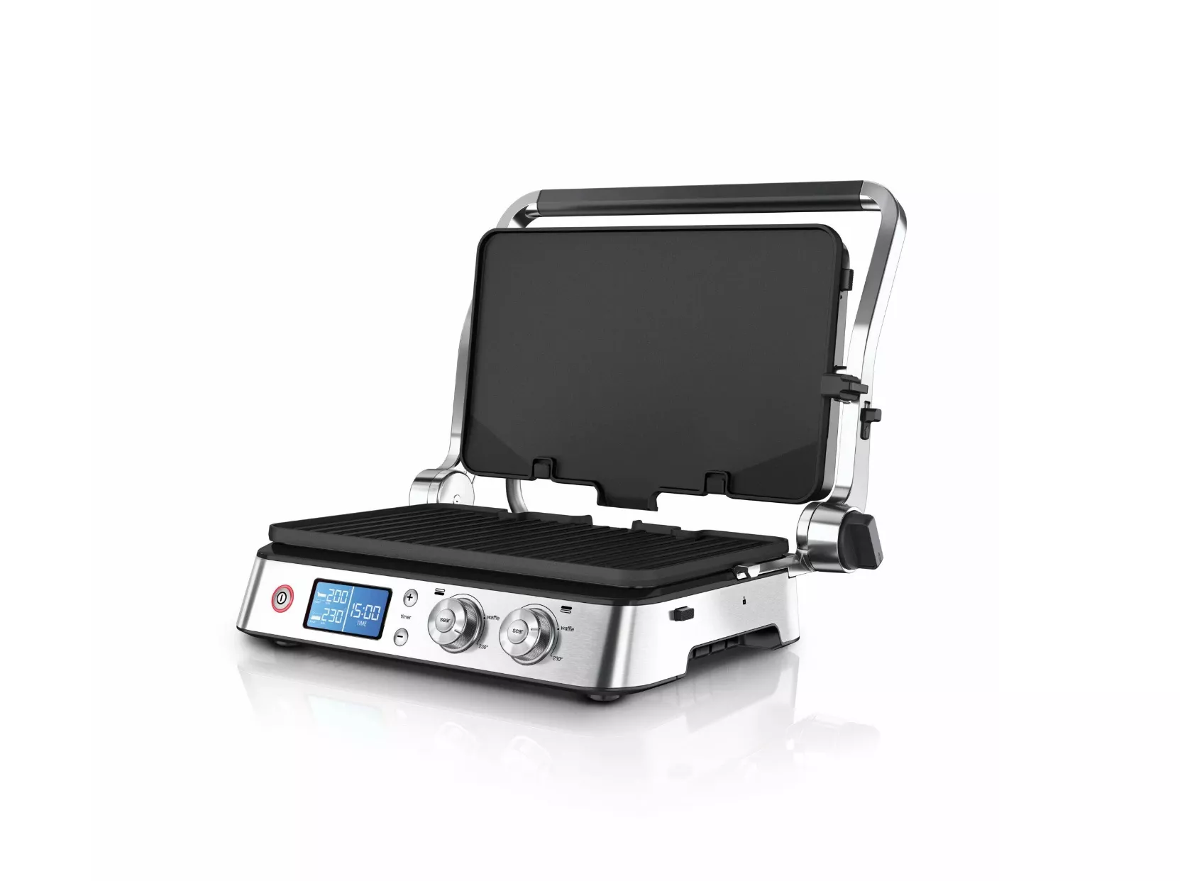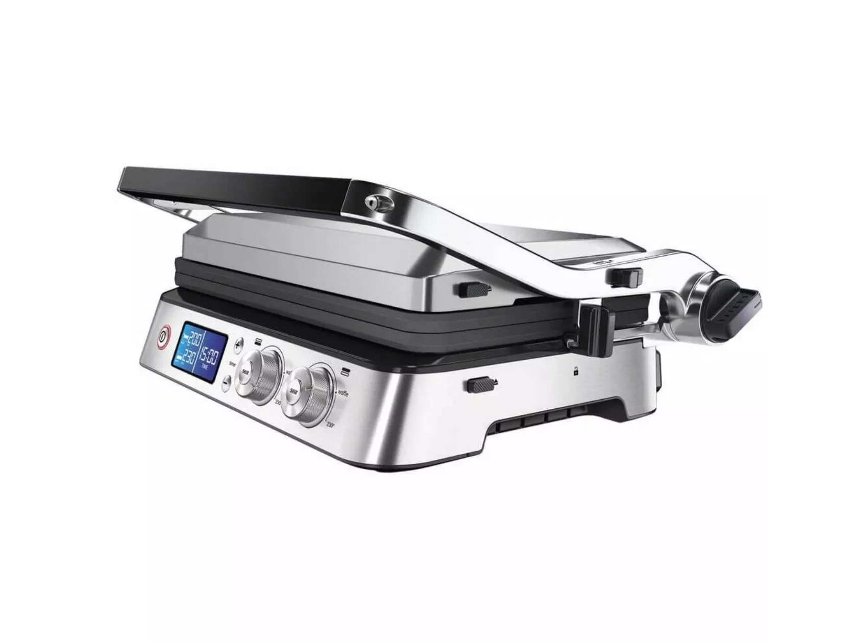 Процесс нагрева сопровождается световой индикация, а о готовности к работе оповещает звуковой сигнал. Настройки отображает встроенный дисплей. Есть таймер, с помощью которого программируется продолжительность приготовления. После истечения заданного времени электрогриль отключается автоматически.