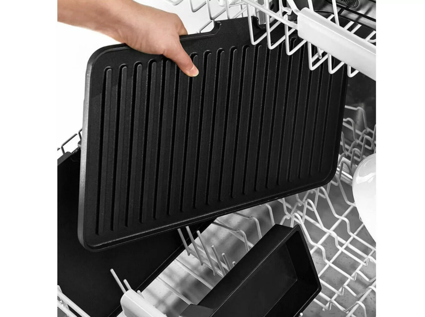Полезен режим Sear: при его активации прибор быстро разогревается до высокой температуры и поддерживает ее несколько минут. Это удобно для жарки толстых кусков мяса: на них образуется румяная корочка, а внутри сохранится сочность. Режим можно включить раз в 30 минут. Все схемные элементы электрогриля можно мыть в посудомоечной машине.