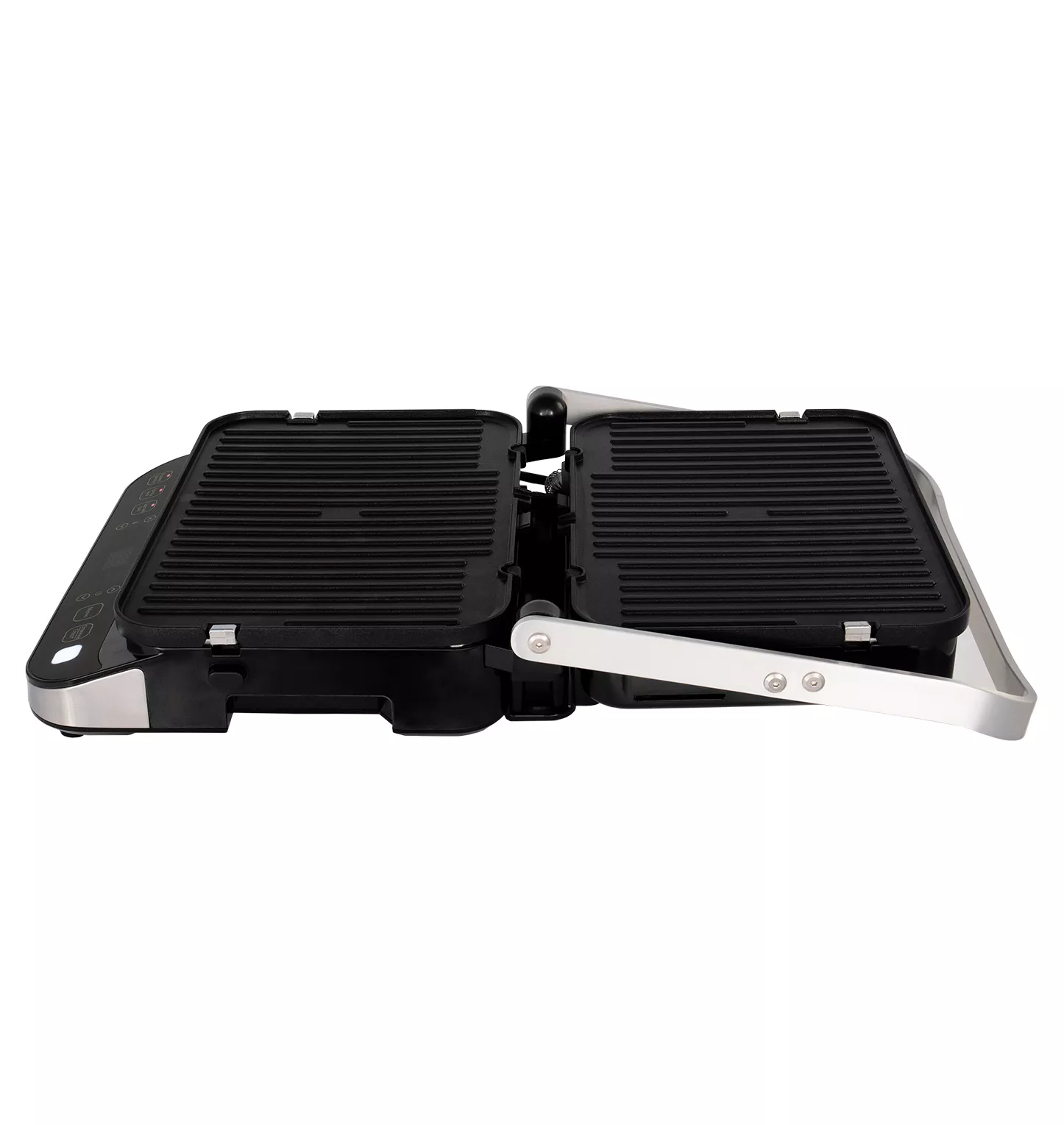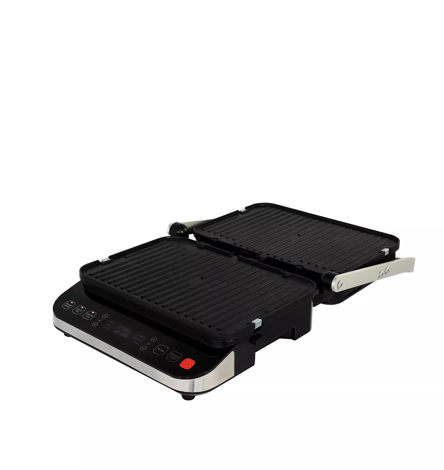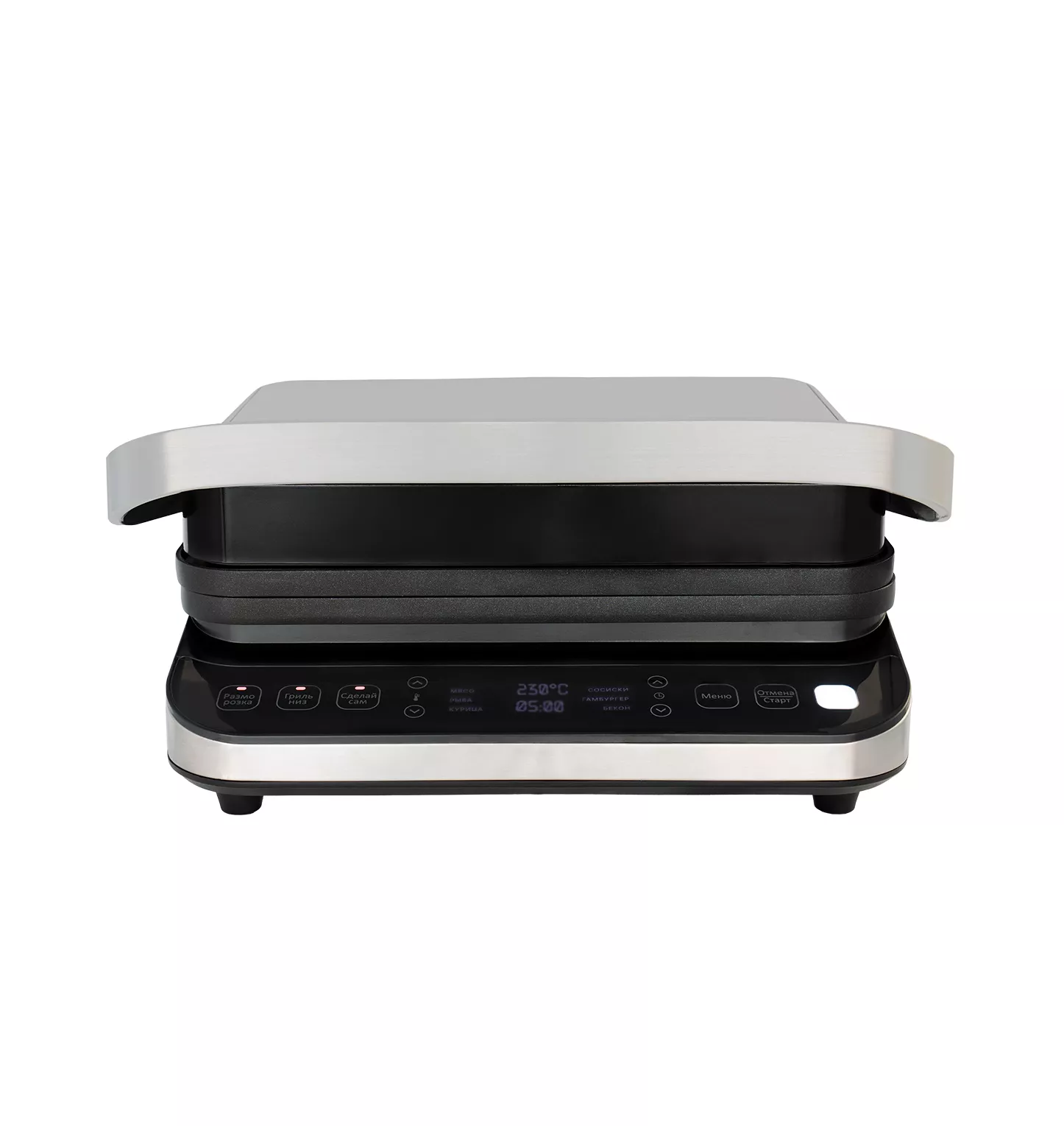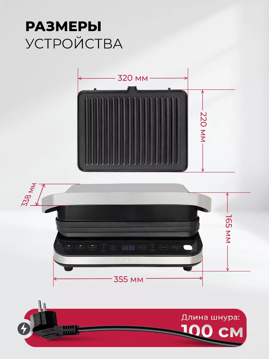 Компактный электрогриль мощностью 2000 Вт с электронным управлением LXGR 5005 позволяет быстро и качественно приготовить Ваши любимые блюда из мяса, рыбы, овощей с помощью 6 автоматических режимов приготовления, а также расширить свои кулинарные умения с помощью индивидуальных настроек в режиме СДЕЛАЙ САМ (DIY), используя регулировку температуры от 80*С до 230*С и времени приготовления от 30 сек до 60 минут, по Вашему желанию. Приятным дополнением также станет возможность использовать двухсторонние антипригарные пластины: рифленая – подходит для жарки стейков из мяса, рыбы, птицы, котлет, гамбургеров, овощей, а плоская – предназначена для приготовления яичницы, омлета, оладьев, блинов, сэндвичей, тостов, морепродуктов. Комбинируйте стороны пластин по Вашему усмотрению! Вместительный маслоприемник, как и панели, легко снимается для обслуживания и удобен в хранении. Цветовой сенсор индикатор всегда покажет степень готовности продукта, а конструктивная особенность открывания пластин на 180 градусов – позволит превратить Ваш прибор в полноценную жаровню. Рецепты и советы по настройкам в инструкции помогут Вам на начальном этапе познания Ваших кулинарных способностей с использованием гриля.