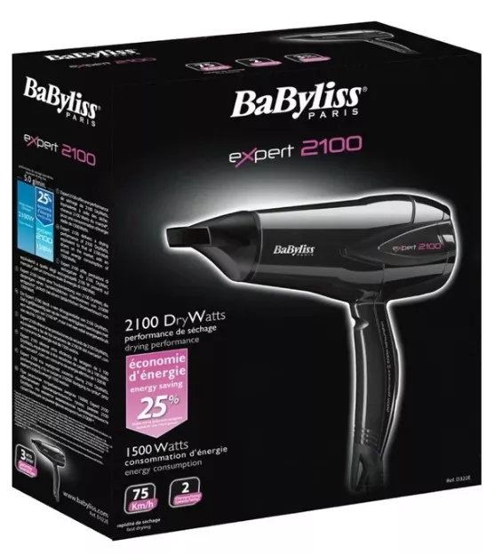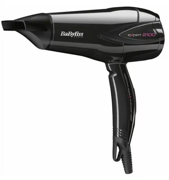 Фен Babyliss D563DE в корпусе черного цвета обладает мощностью 2100 Вт. Для удобства работы, в устройстве предусмотрено 2 температурных режима, 2 режима регулировки скорости воздушного потока и функция холодного обдува.