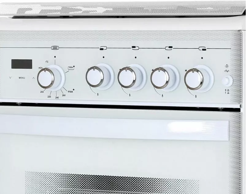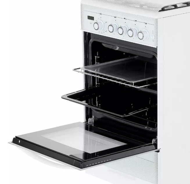 Духовка объемом 52 литра оснащена грилем и вертелом для приготовления разнообразных блюд. Термостат и яркая подсветка обеспечивают удобство использования. Очистка духовки осуществляется традиционным способом.