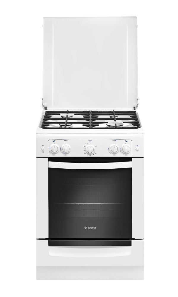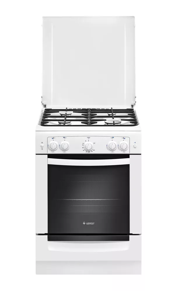 GEFEST ПГ 6100-02 0309 — газовая плита белого цвета, производимая в Беларуси. Выполнена в классическом дизайне, имеет поворотные ручки управления.