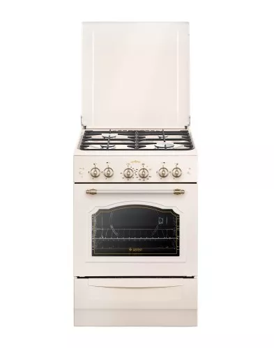 Полноразмерная газовая плита, выполнена в кремовом цвете, фасад дополнен декором в ретро-стиле, ручка на дверце духовки с металлической накладкой. Модель поставляется с защитной крышкой из металла, окрашенной в цвет плиты. Все газовые горелки с механическим электроподжигом, кнопка розжига находится на панели управления. Там же расположен механический таймер, со звуковым сигналом об окончании заданного времени приготовления. Для хранения кухонных принадлежностей предусмотрен выдвижной ящик.