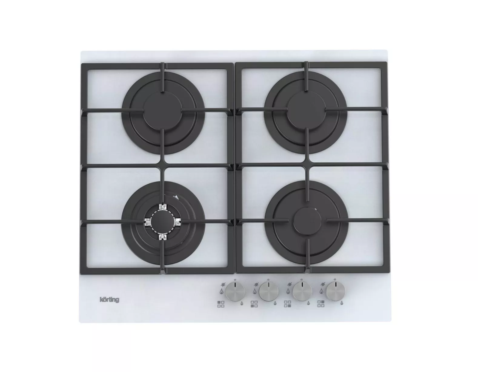Цвет: белое стекло, металлические регуляторы — хорошо подходит к светлым кухням, сканди и современным гарнитурам, особенно в комплекте с белым духовым шкафом и вытяжкой Korting.