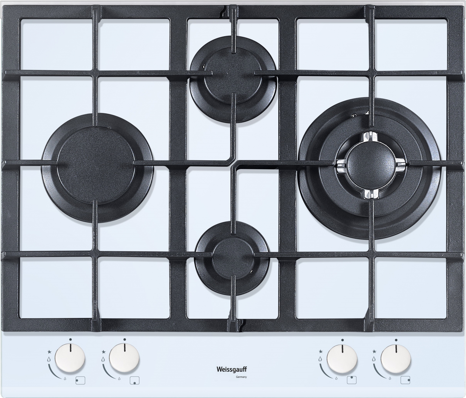 Газовая панель Weissgauff с крестообразным расположением конфорок, исполненная на белом закалённом стекле - это возможность готовить сразу на четырёх зонах, не ограничивая себя в удобстве