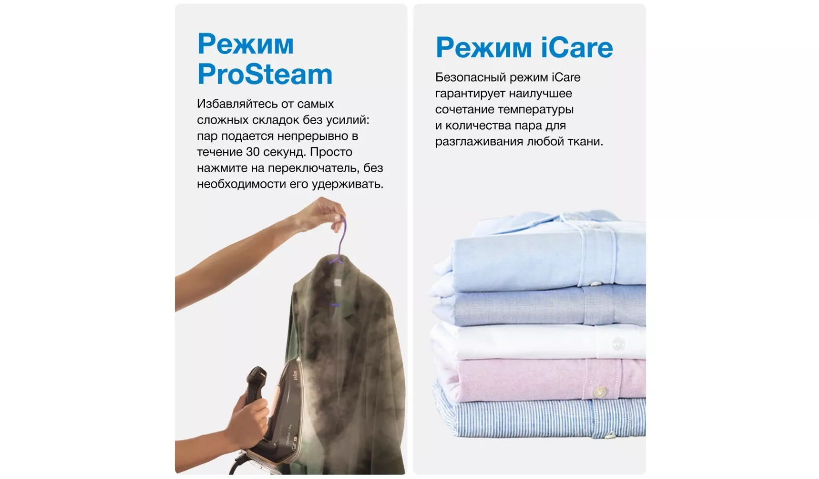 Безопасный режим iCare гарантирует наилучшее сочетание температуры и количества пара для разглаживания любой ткани.