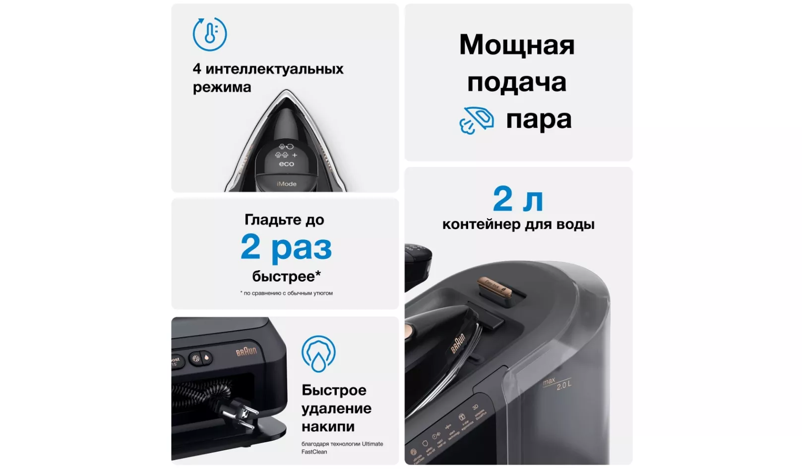 Функция Ultimate FastClean, обеспечивает более быструю и легкую процедуру удаления накипи. Уникальная подошва Free Glide 3D позволяет легко преодолевать препятствия, такие как пуговицы и карманы. Подошва утюга, вдохновлённая формой сноуборда, скользит на 360º, преодолевая любые препятствия. С технологией IMode вы сможете переключаться между четырьмя режимами одним касанием, не отвлекаясь от глажения.
