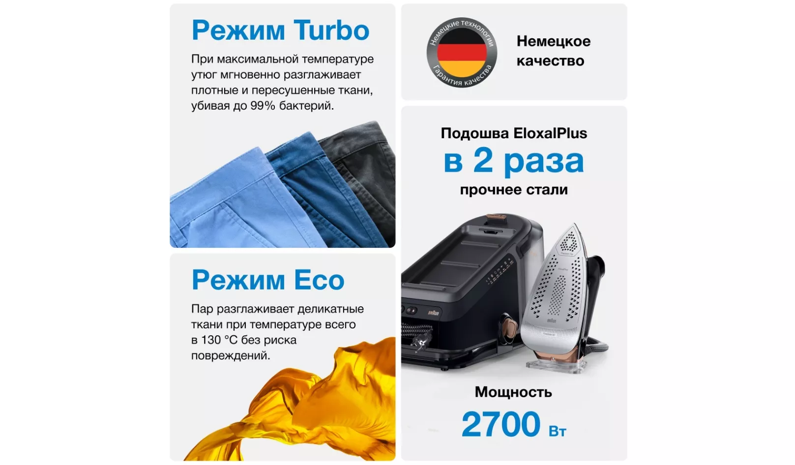Режим Turbo: Режим, при котором процесс глажения происходит при максимальной температуре 190 ºC , утюг мгновенно разглаживает плотные и пересушенные ткани, убивая до 99% бактерий.
