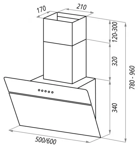 Корпус сделан из нержавеющей стали. На фасаде цвета находится откидная панель, выполненная из закаленного стекла. За ней располагается легко снимающийся жироулавливающий алюминиевый фильтр. Загрязненный воздух втягивается по всему периметру панели.