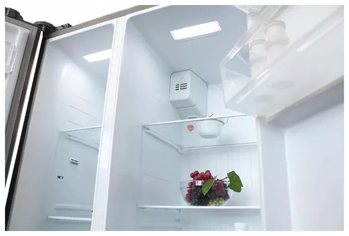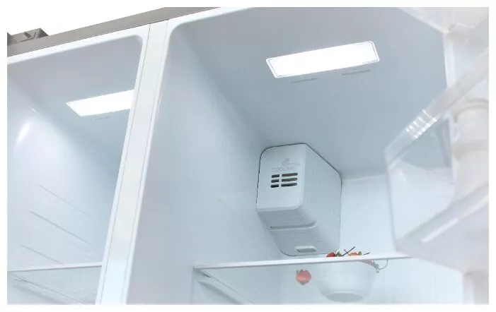 Холодильник с распашными дверями (Side by Side) Бирюса SBS 587 WG станет отличным выбором для пользователей, нуждающихся в размещении очень большого количества продуктов, в том числе – замороженных. Объем морозильной камеры, которая расположена слева, составляет 175 л, а объем холодильной камеры – 335 л. Общий полезный объем холодильника – 510 л. «Обслуживанием» устройства «занят» инверторный компрессор, сочетающий в себе малошумность, низкий уровень энергопотребления и значительный ресурс. Холодильник соответствует высокому (A+) классу энергоэффективности. За год модель потребляет около 405 кВт·ч. Номинальная потребляемая мощность составляет 240 Вт. Уровень шума в процессе работы холодильника – не более 43 дБ. Система освещения базируется на светодиодах. Источники света данного типа отличаются очень высокой яркостью и минимальным потреблением энергии.