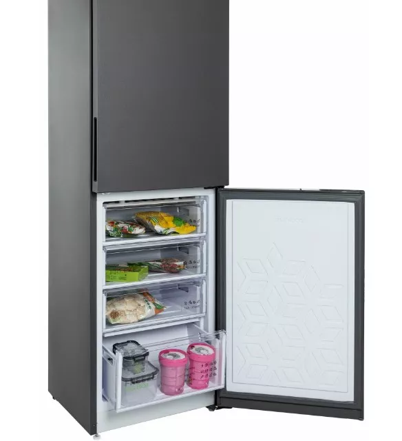 Холодильник выполнен в насыщенном цвете «матовый графит». Такой оттенок не маркий, отлично скрывает мелкие отпечатки и гармонично сочетается с любым интерьером — от классического до хай-тека. Лаконичные линии и отсутствие лишних деталей делают его элегантным и строгим.