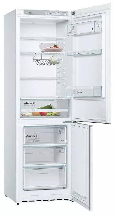 Объем холодильной камеры составляет 223 л, а морозильной – 94 л. Такие характеристики позволяют разместить в обеих камерах довольно большое количество продуктов питания. BOSCH Serie 4 KGV36XW21R принадлежит к классу энергоэффективности А+ за счет годового расхода электроэнергии в 291 кВтч.