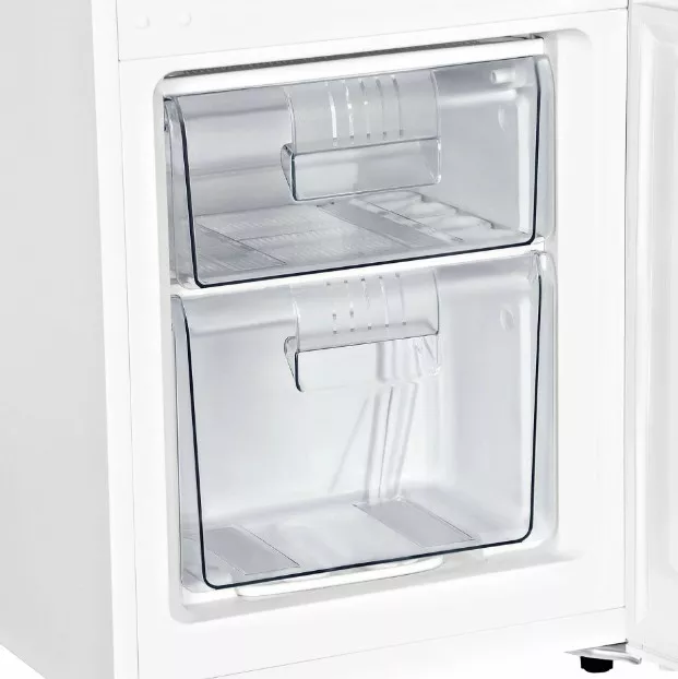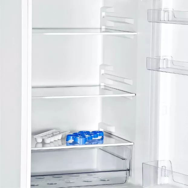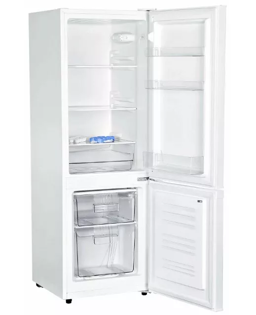Данная модель имеет классическую двухкамерную конфигурацию (с нижним расположением морозилки), которая работает от одного компрессора. Полезный объём холодильной камеры составляет 120 л, а морозильной – 34 л. В верхней части прибора предусмотрено три полки из закаленного стекла и один ящик, в нижней – два просторных ящика. Поддерживать чистоту внутри холодильника легко, для этого не потребуется ни специальных средств, ни инструментов. Кроме того, закаленное стекло прочное и устойчиво к повреждениям.