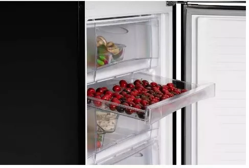 в морозильной камере — 3 прозрачных ящика, два из которых увеличенного объема. Это позволяет легко хранить крупные запасы: мясо, курицу, полуфабрикаты и другие замороженные продукты;