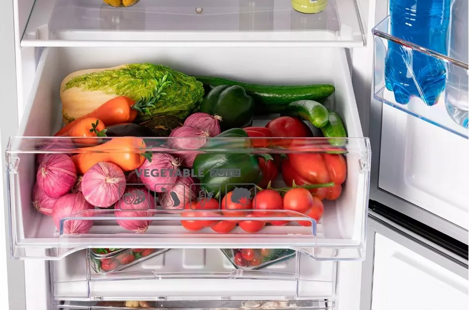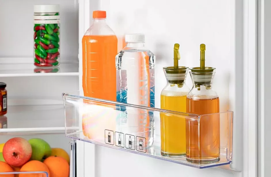 Внутренняя посуда холодильника имеет красивый серебристый отлив и инфографику на ящиках и дверных полках.