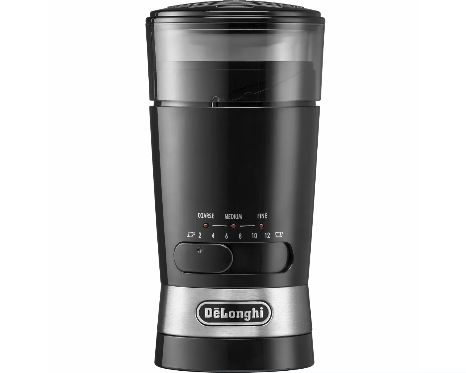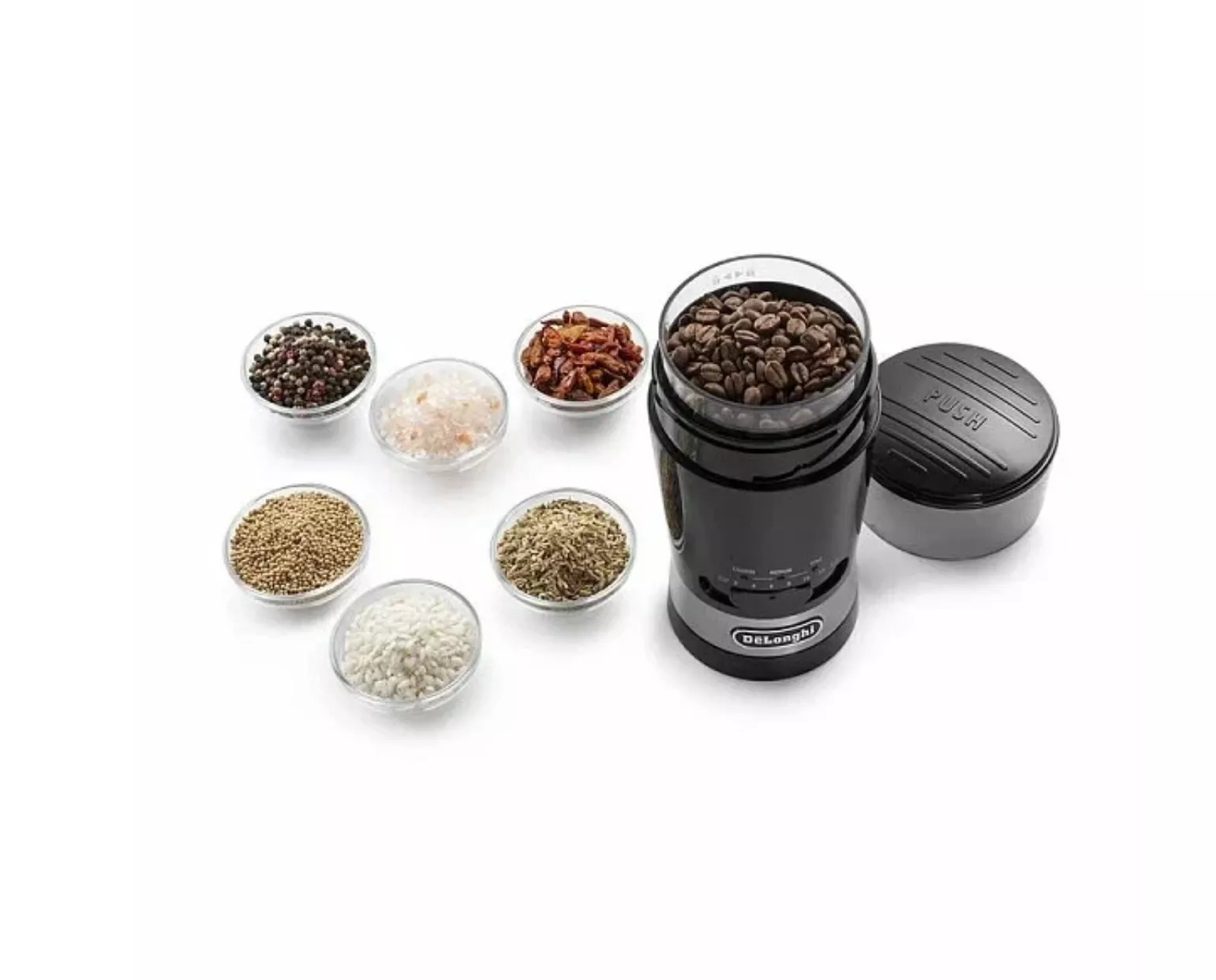 Поклонники кофе уже привыкли, что современные, даже очень хорошие кофемолки, это довольно громоздкие устройства. Пусть и не настолько большие как кофеварки или кофемашины, все-таки они вынуждают подумать о поиске дополнительного места под установку. Но все меняется с покупкой кофемолки DeLonghi KG 210. Взгляните – она по размерам сравнима со стаканом большой емкости (22,3x11,1x11,1 см), да и внешне очень похожа на него! Масса пластикового корпуса составляет всего 1 кг. Таким образом, вы сможете не только без труда найти для нее отдельный уголок на кухне, но даже взять с собой в путешествие или на дачу.