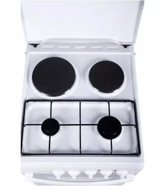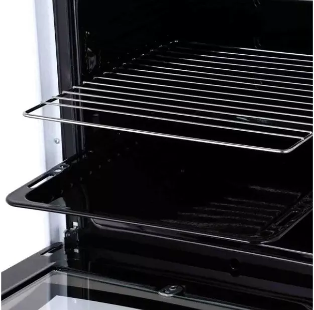 Плита 4 конфорки предлагает сбалансированную мощность: передняя правая достигает 2,1 кВт для быстрого кипения, задняя левая 1,5 кВт для равномерного тушения, а остальные варианты от 1,0 до 1,3 кВт подходят для варки и жарки. Эмалевая рабочая поверхность легко очищается от загрязнений, а профильная решетка устойчиво держит тяжелую посуду. Плита с духовкой электрической объемом 50 л оснащена верхним ТЭНом на 0,8 кВт и нижним на 1,2 кВт, что гарантирует равномерное пропекание мяса или выпечки, а встроенная подсветка помогает следить за процессом без лишних открываний дверцы.