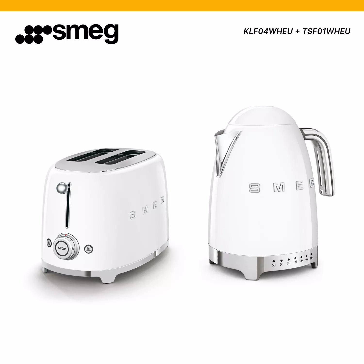 Комплект Smeg с чайником KLF04WHEU и тостером TSF01WHEU — это стильный «набор для завтрака» в белом цвете в культовом дизайне 50-х годов, который одновременно украшает кухню и делает утренние ритуалы заметно комфортнее.