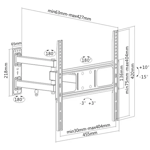 наклон: +10°~-15°, поворот: до 180 град, отступ от стены: 63 - 427 мм