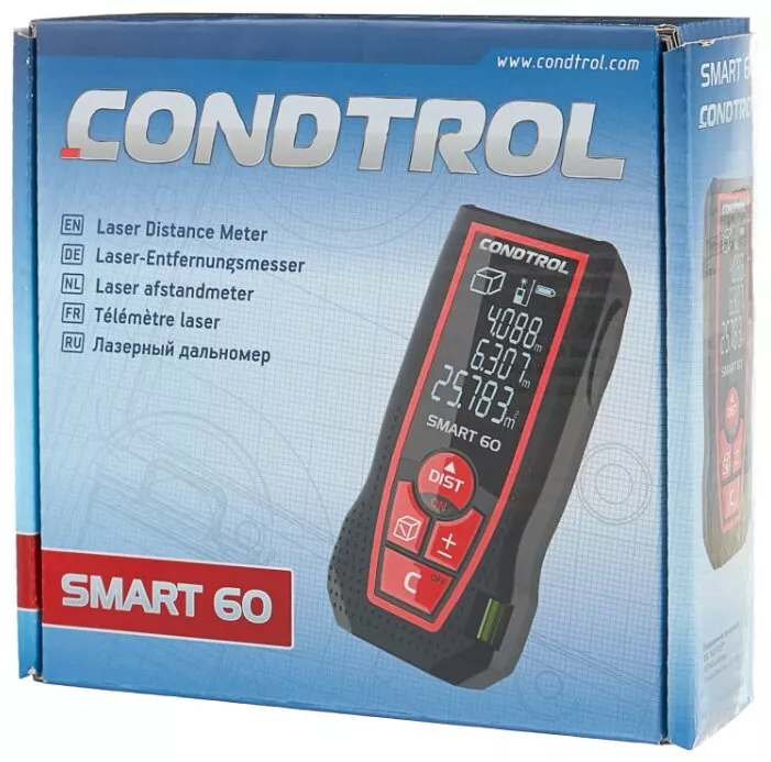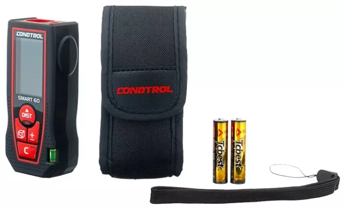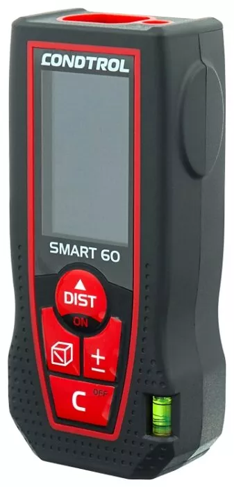 Лазерный дальномер Condtrol Smart 60 – модель от широко известного производителя профессиональных измерительных приборов. Дальномер будет полезен строителям, проектировщикам, а также другим пользователям, которые испытывают необходимость в бесконтактном измерении расстояний. Прибор подходит для измерения расстояний в очень широком диапазоне – от 5 см до 60 м. Погрешность при этом не превышает ± 1.5 мм. В качестве единиц измерения могут использоваться миллиметры, футы и дюймы. Функциональность дальномера расширена благодаря наличию функций расчета объема, расчета площади, сложения и вычитания, а также функции Пифагора.