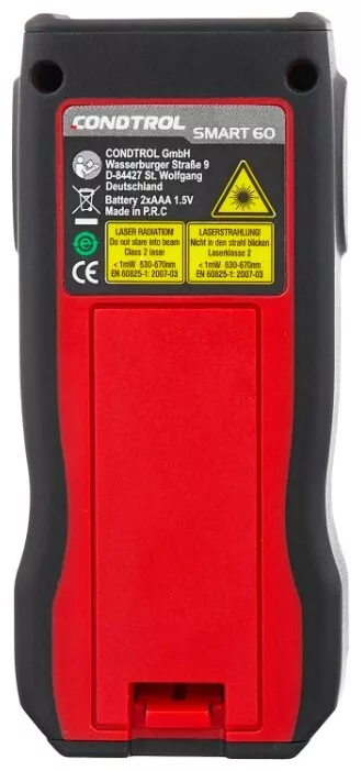 Высокопрочный пластиковый корпус с резиновым уплотнением защищает дальномер от случайных падений. Эргономичная форма и рельефная поверхность не дают лазерной рулетке скользить в руке. Лазерная рулетка CONDTROL SMART 60 будет полезна не только профильным специалистам: строителям, отделочникам, монтажникам, замерщикам окон, установщикам мебели, но и домашним мастерам. Дальномер поможет быстро определить необходимое количество отделочных материалов во время ремонта, измерить площадь квартиры или дома при покупке жилья и т. д.