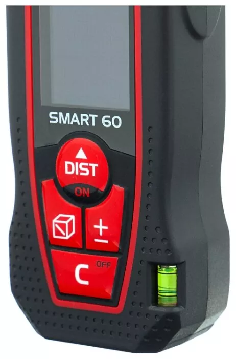 Во время замера расстояния между вертикальными конструкциями (стены, оконные и дверные проемы, колонны) лазерный луч должен располагаться строго горизонтально относительно поверхности измерения. Несоблюдение этого условия ведёт к увеличению погрешности. Пузырьковый уровень, которым оснащён CONDTROL SMART 60, позволяет легко контролировать горизонтальное положение лазерной рулетки, благодаря чему можно получить максимально точные результаты. CONDTROL SMART 60 оснащён большим инверсионным дисплеем. Крупные цифры и символы на экране создают комфортные условия для работы даже в условиях плохого освещения. Лазерная рулетка обладает максимально простым и понятным интерфейсом, поэтому разобраться с управлением можно даже без прочтения инструкции. Для включения нужной функции достаточно нажать на кнопку с соответствующим символом.