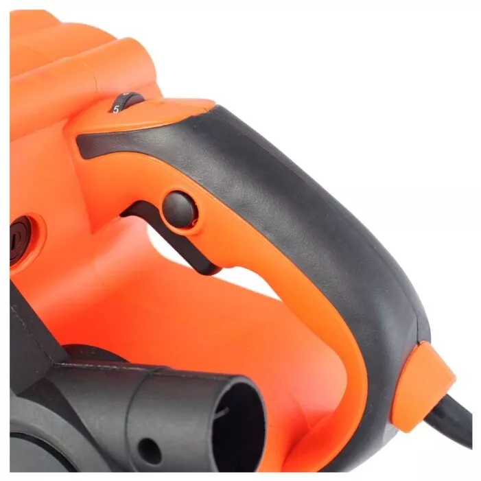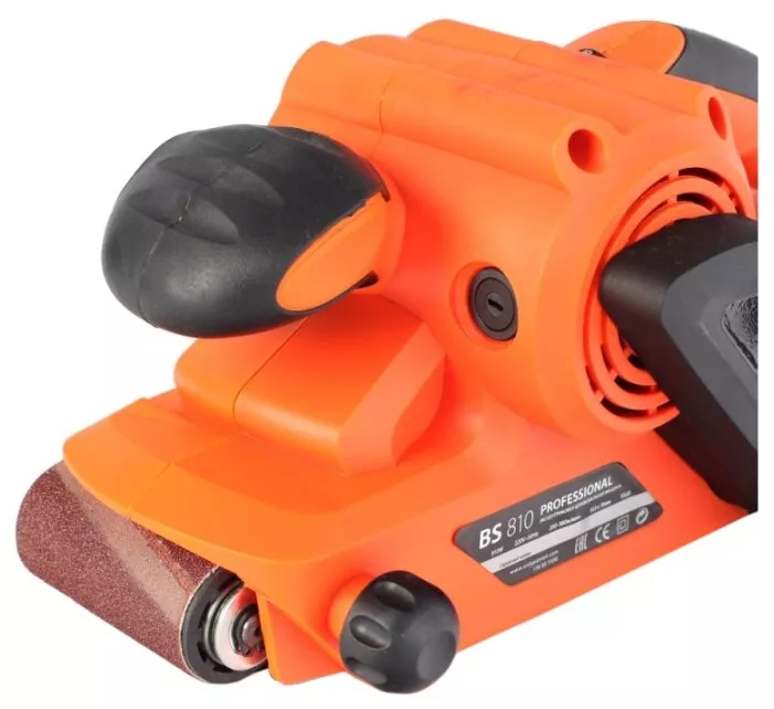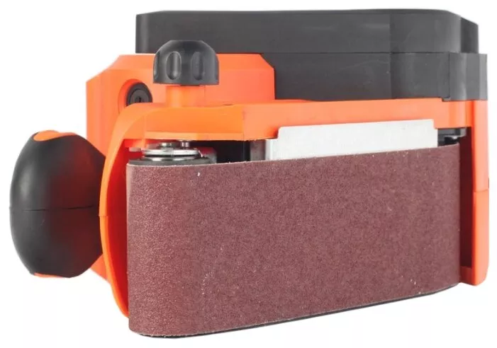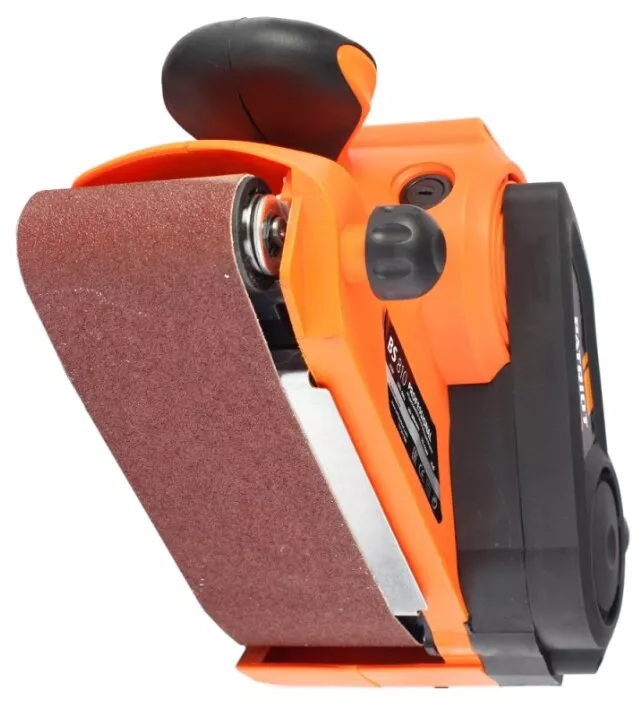 Ленточно-шлифовальная машина средней мощности с эргономичными резиновыми рукоятками для удобного хвата и регулировкой скорости подачи ленты.