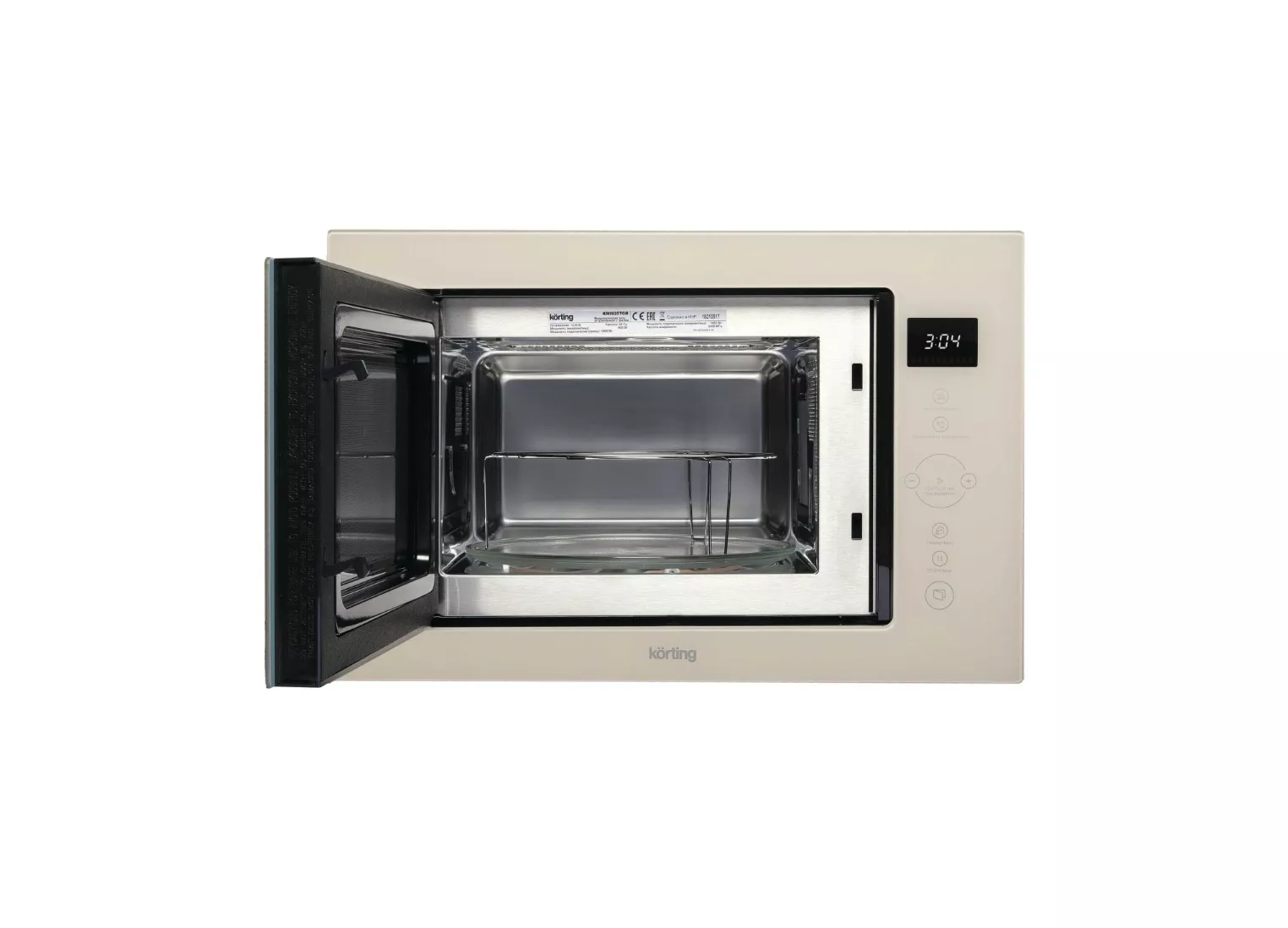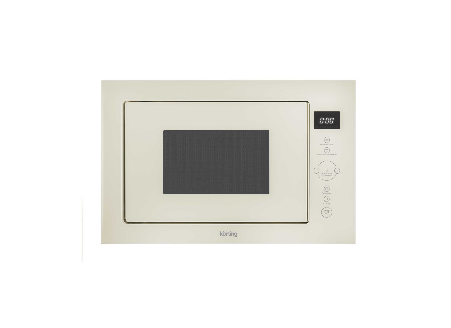 Микроволновая печь Korting KMI 825 TGB — встраиваемая СВЧ 25 л в бежевом стекле с кварцевым грилем 1000 Вт и сенсорным управлением, идеально подходящая для кухонь в теплых классических и неоклассических интерьерах.