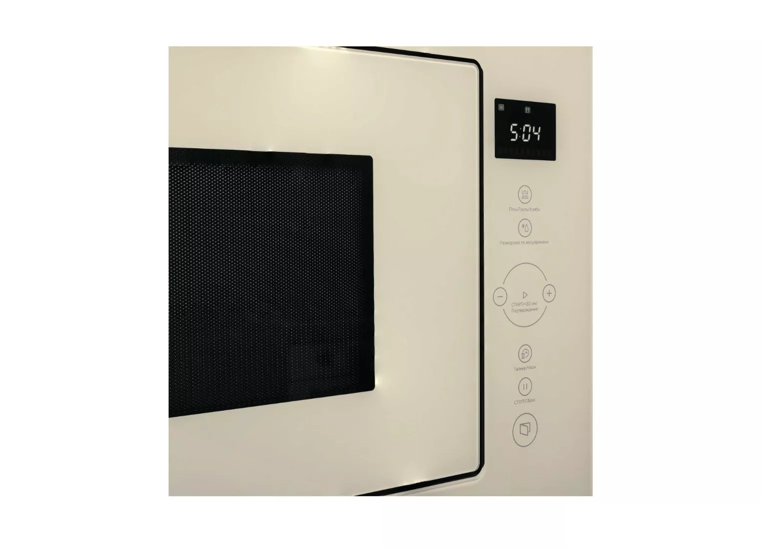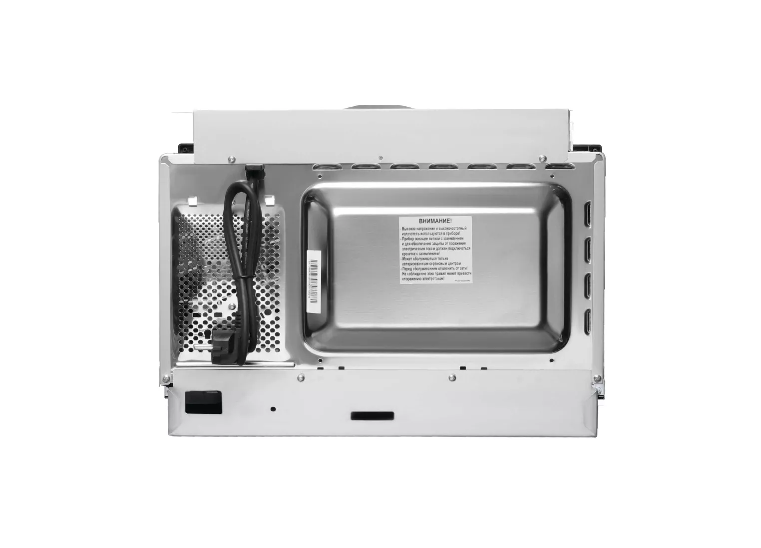 Ширина 59,5 см и стандартные размеры ниши 380 × 600 × 450 мм позволяют встроить микроволновку в колонну или пенал, сохранив единый цвет и стиль кухонного гарнитура.