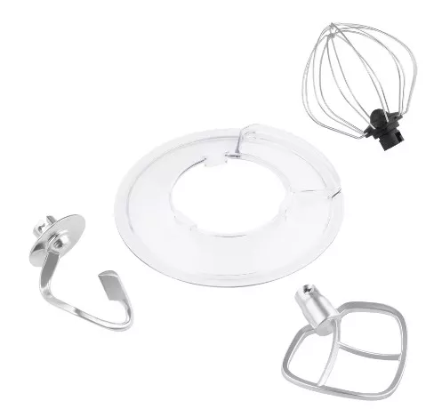 • Три ключевые насадки входят в базовый набор: венчик для воздуха и яиц, крюк для замешивания дрожжевого и даже самого крутого теста, а также лопатка для аккуратного смешивания ингредиентов.