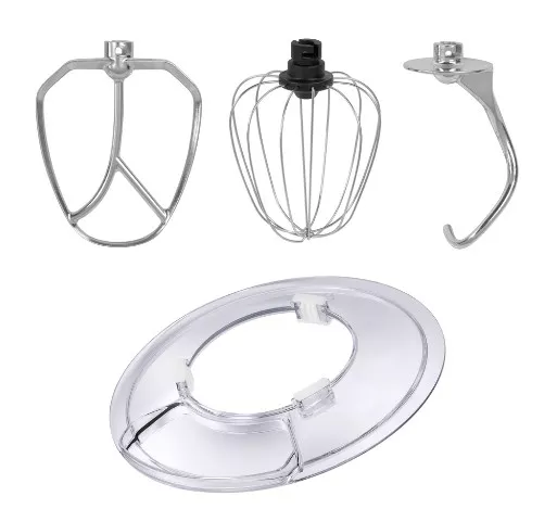 • Полная комплектация: В набор входят три основные насадки – крюк для замешивания крутого теста, венчик для взбивания и лопатка для смешивания. Специальная крышка надежно защищает от брызг.