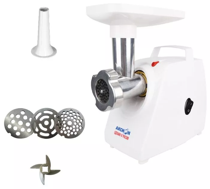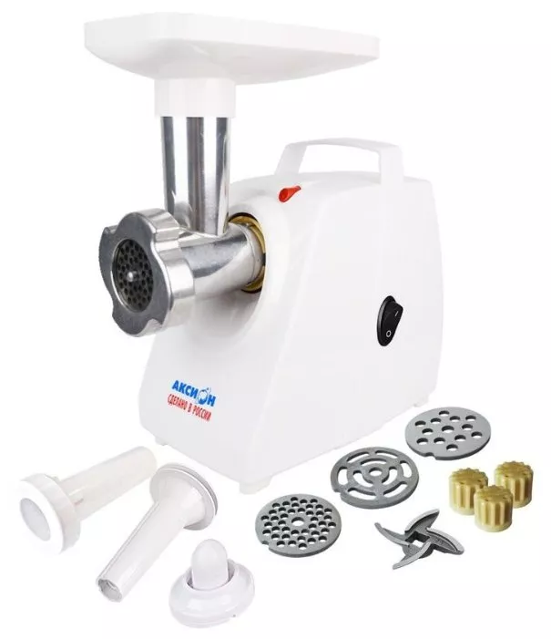 Корпус мясорубки Аксион М 34.01 изготовлен полностью и пластика, но это совсем не говорит о сомнительном качестве устройства: мясорубка наоборот будет легкой для транспортировки и удобной в пользовании. Прибор может работать непрерывно в течение 10 минут: двигатель мясорубки предусматривает защиту двигателя от перегрузки, что позволяет ей автоматически отключаться по прошествии этого времени. В комплекте предусмотрено 3 перфорированных диска для измельчения мяса, насадки для приготовления кеббе и колбасок. Хранить насадки можно в специальном отсеке, предусмотренном в корпусе мясорубки.