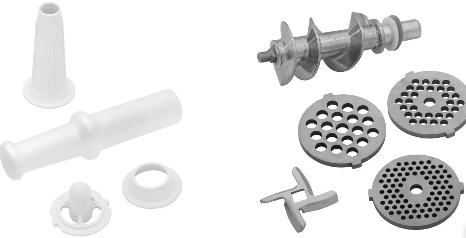 Нож, крупная решетка, средняя решетка, мелкая решетка, насадка для колбас, насадка для кеббе |