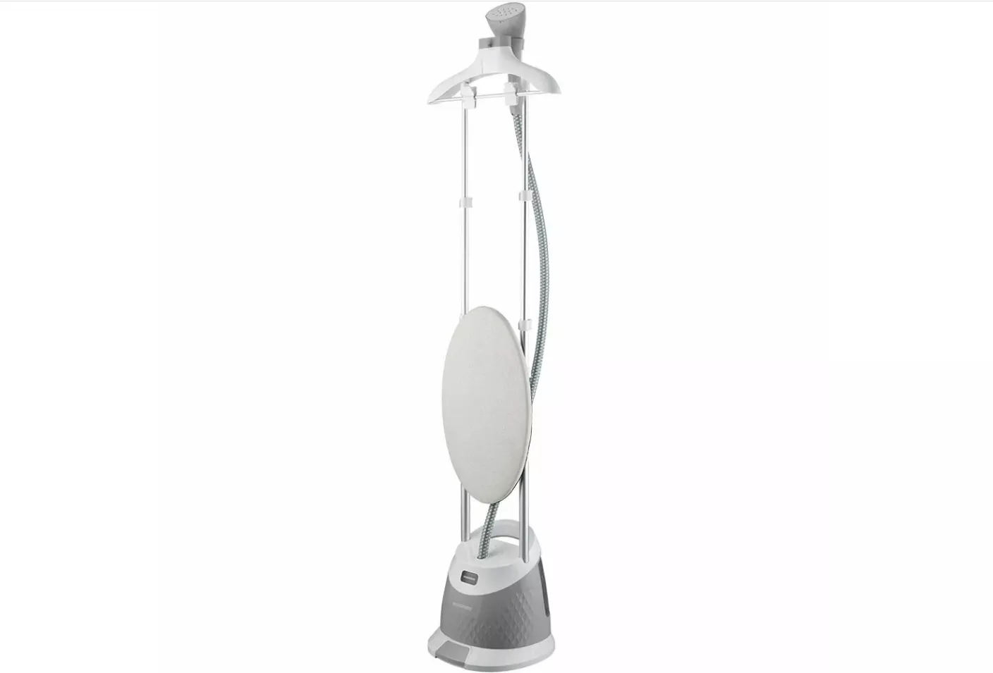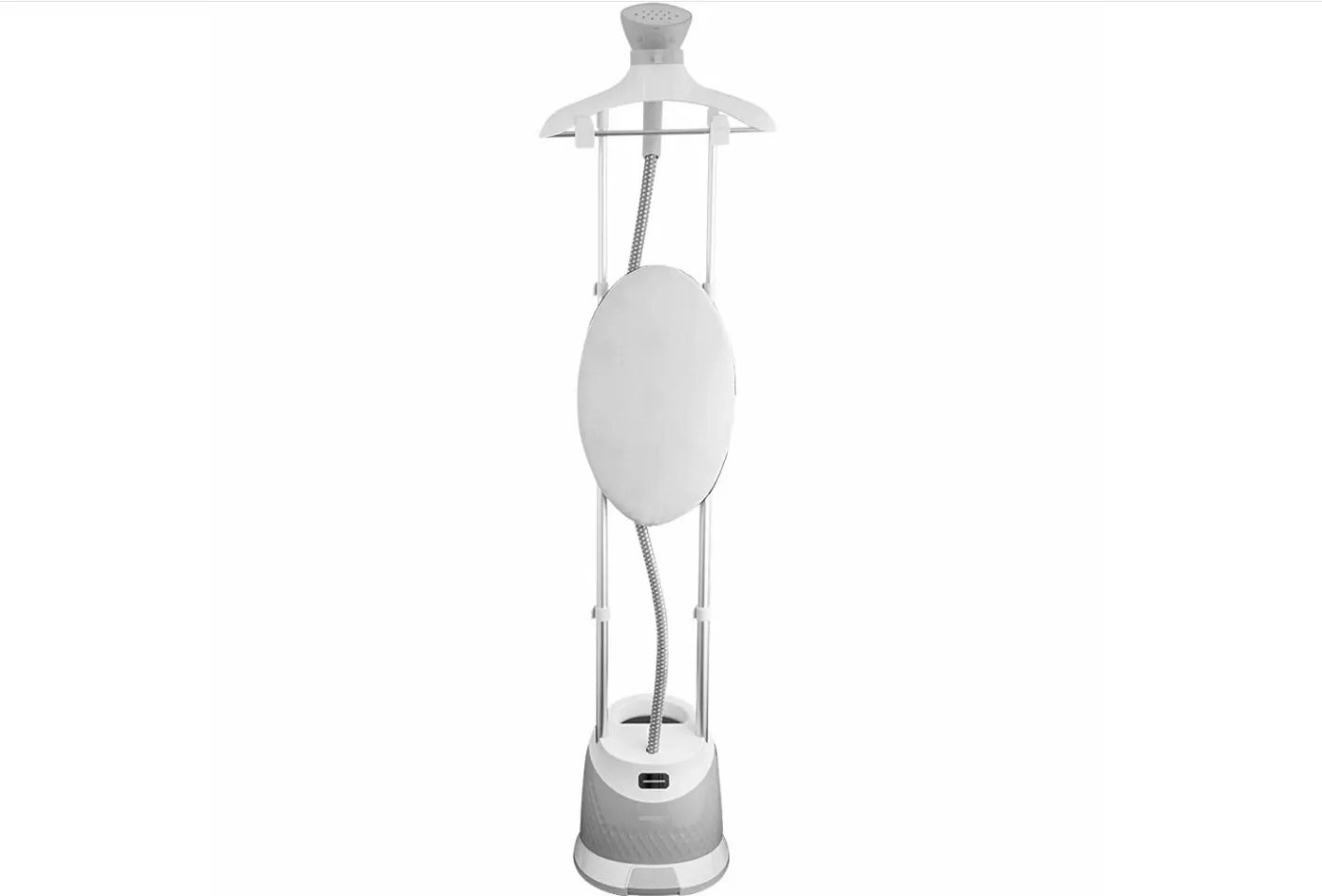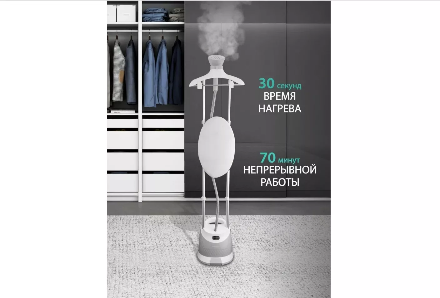 Отпарить одежду можно на вешалке либо на съемной гладильной доске. Доску можно установить на отпаривателе в вертикальном или горизонтальном положении. Телескопические шесты, на которых расположена вешалка, регулируются по высоте до 1,3 метра, что позволяет отпаривать вещи на удобном уровне. Устройство будет готово к работе через 30 секунд после включения с помощью кнопки в нижней части корпуса отпаривателя, которую удобно нажимать ногой.