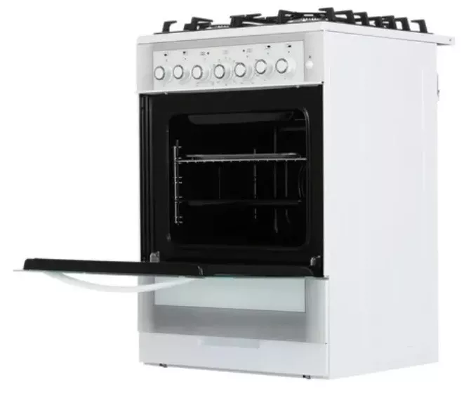 Плита имеет компактные размеры (85х60х60 см) и откидную дверцу, что облегчает доступ к духовке и ящику для посуды.