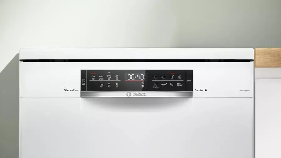 С инверторным двигателем EcoSilence Drive, эта посудомоечная машина работает очень тихо, что делает ее идеальным выбором для тех, кто ценит спокойствие и тишину в доме. Также она оснащена функцией HygienePlus, которая гарантирует гигиеничную чистоту посуды, уничтожая до 99,9% бактерий и микробов. Другой важной особенностью является функция SpeedPerfectPlus, которая значительно сокращает время мойки посуды без потери в качестве. Кроме того, благодаря функции IntensiveZone, даже самая грязная посуда будет выглядеть как новая. Управление машиной осуществляется через сенсорные кнопки на открытой панели управления, а также через приложение на смартфоне благодаря функции Home Connect. Это позволяет запускать машину на расстоянии, а также контролировать процесс мойки в реальном времени.