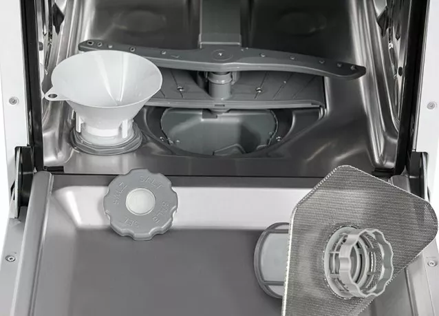Моющие средства загружаются в специальное отделение. Наличие ополаскивателя и соли для смягчения воды можно контролировать с помощью индикаторов на электронной панели.